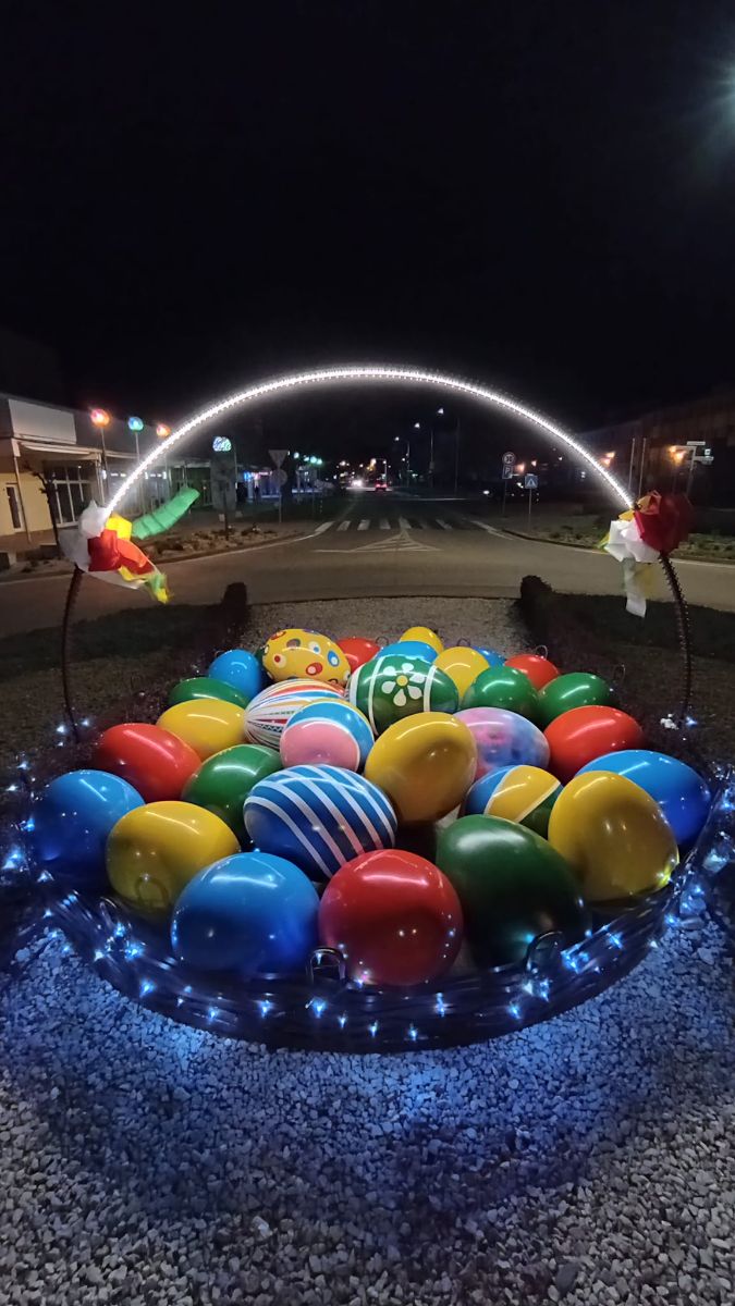 Atmosféru prichádzajúcej Veľkej noci už umocňuje aj svetelný košík plný pestrofarebných vajíčok a stúh na kruhovom objazde v centre mesta na ul. M. R. Štefánika.
