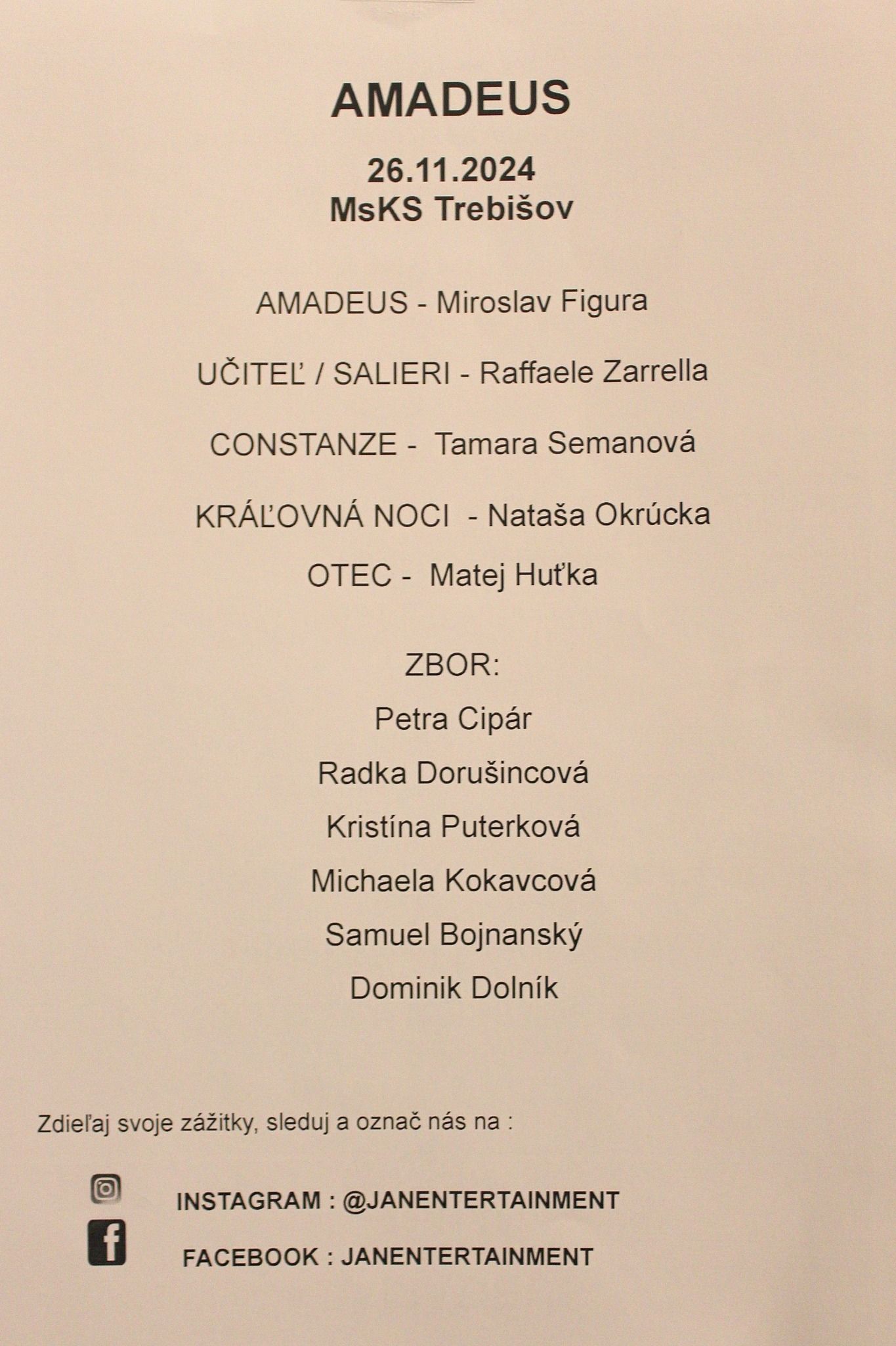 Ďakujeme za úžasné predstavenie a nezabudnuteľný umelecký zážitok, ktorý si odnášame z dramatického príbehu geniálneho skladateľa Wolfganga Amadea Mozarta a jeho osudového súpera Antonia Salieriho.
