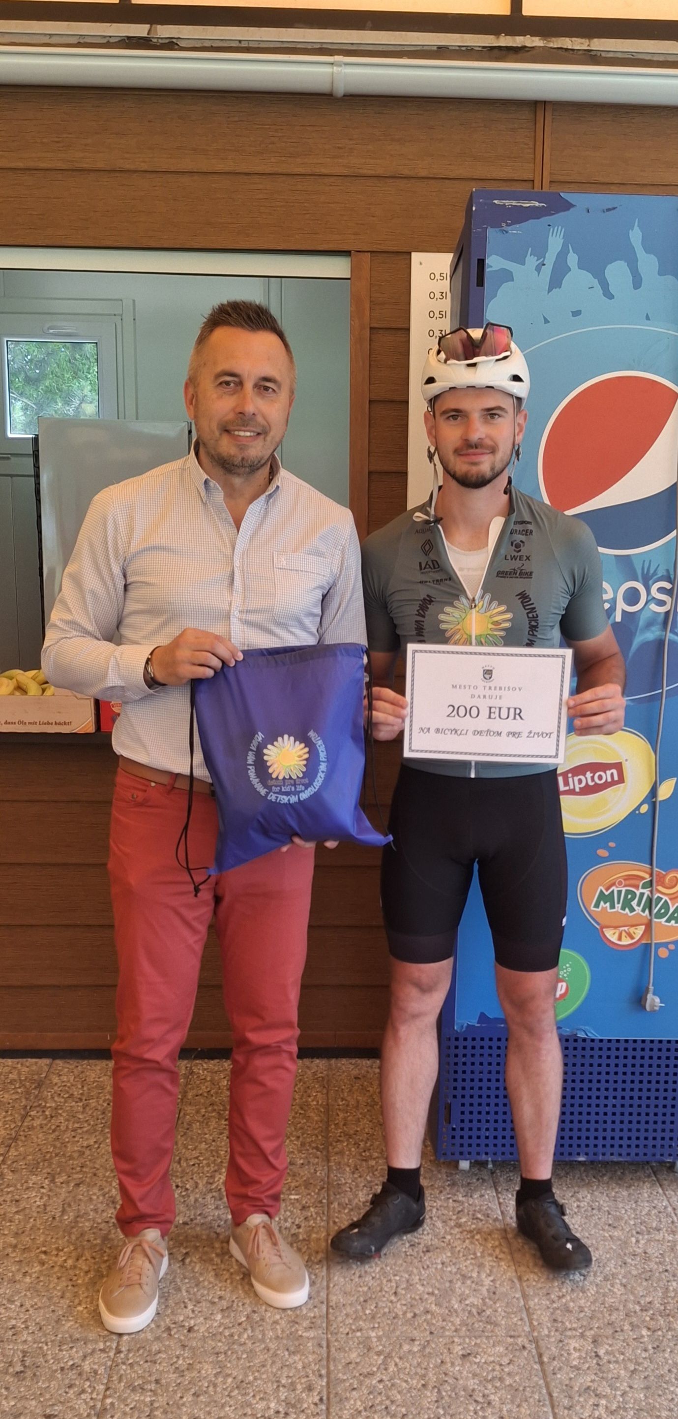 Symbolickým vyjadrením podpory bolo aj odovzdanie finančného daru vo výške 200€ z rúk primátora mesta Trebišov Mareka Čižmára, ktorý cyklistov osobne privítal a poďakoval im za ich prácu a odkaz, ktorý šíria.