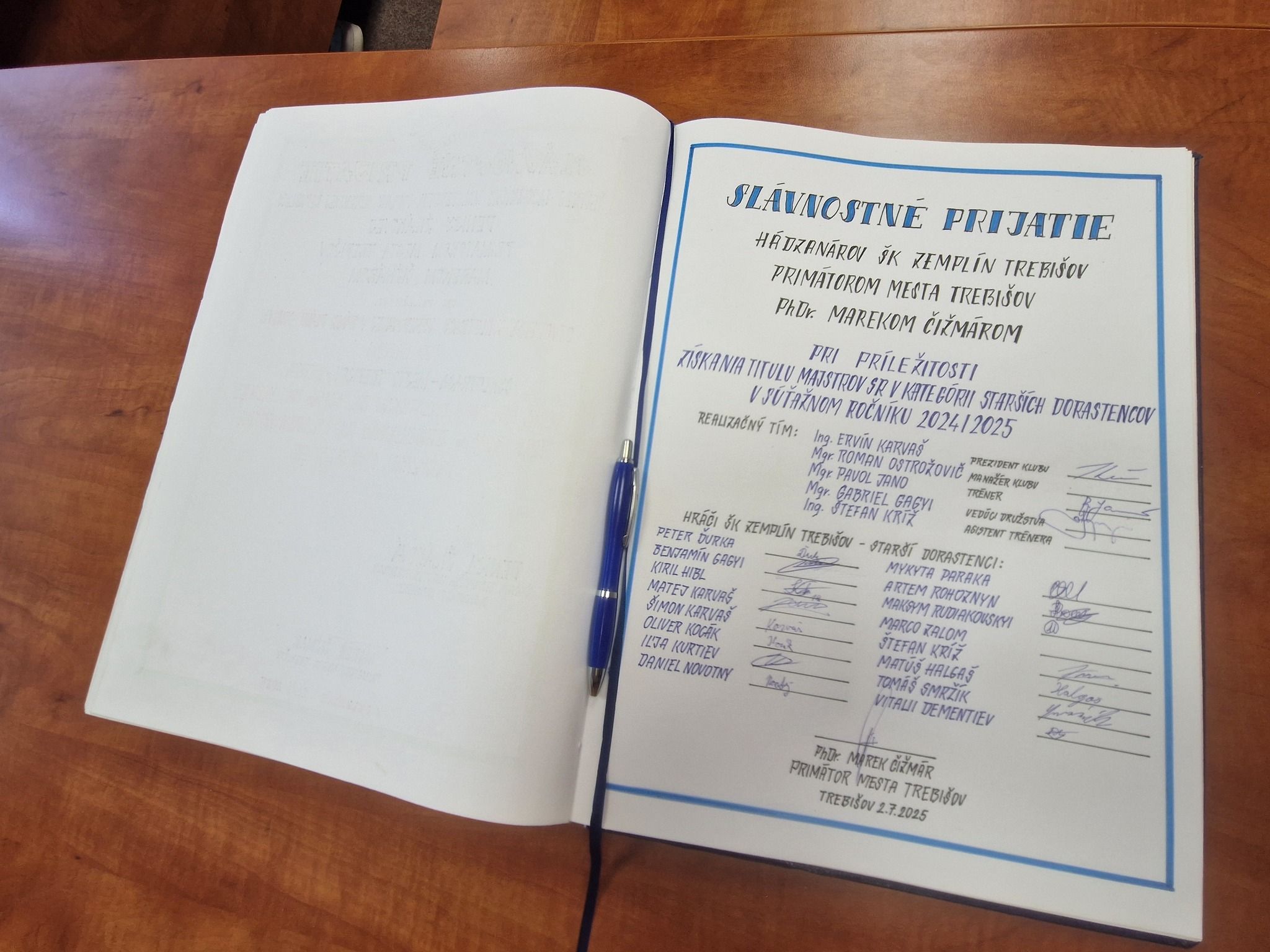 Vynikajúca sezóna, zakončená ziskom ligového titulu majstrov Slovenska v hádzanej v kategórii starších dorastencov a poďakovanie za výbornú reprezentáciu klubu, mesta a regiónu boli dnes spoločným menovateľom oficiálneho prijatia majstrovského tímu ŠK Zemplín Trebišov primátorom mesta Marekom Čižmárom na Mestskom úrade v Trebišove.