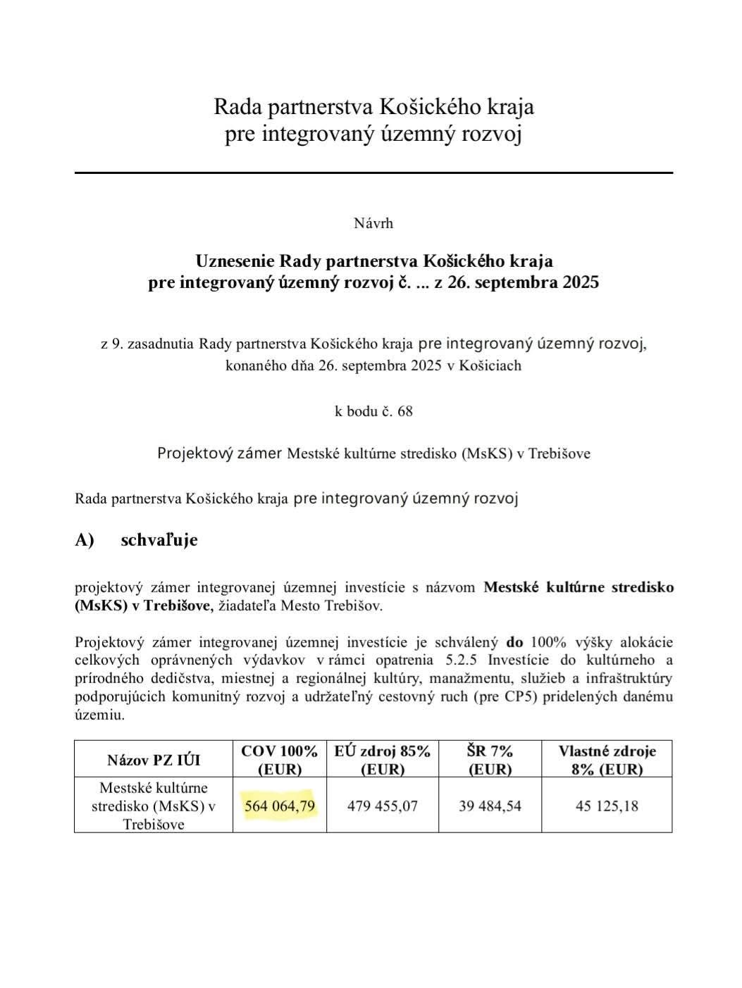 Schválením Rady partnerstva Košického kraja môže mesto Trebišov podať žiadosť o poskytnutie nenávratného finančného príspevku vo výške 564 064,79 eur na projekt Mestské kultúrne stredisko Trebišov (MsKS).