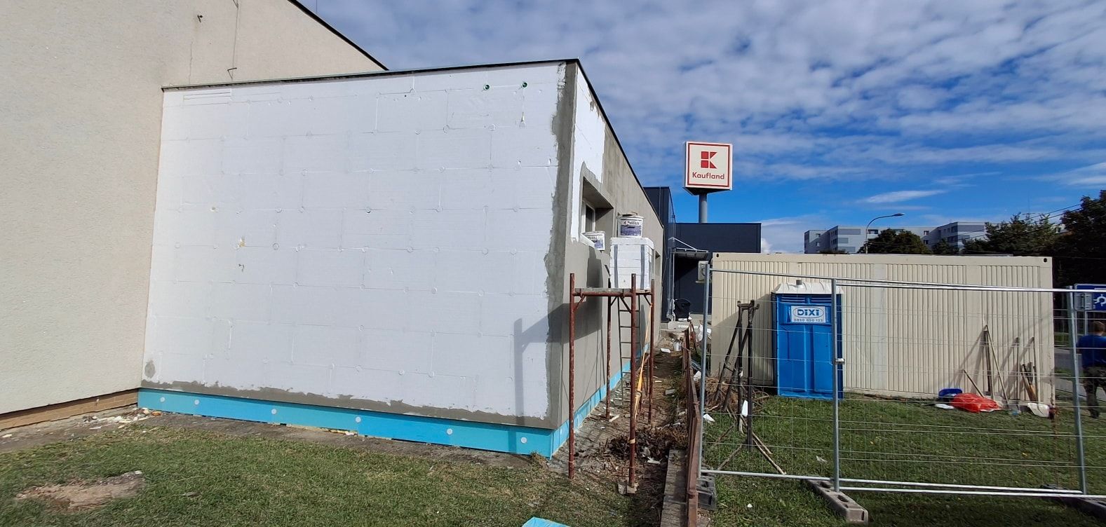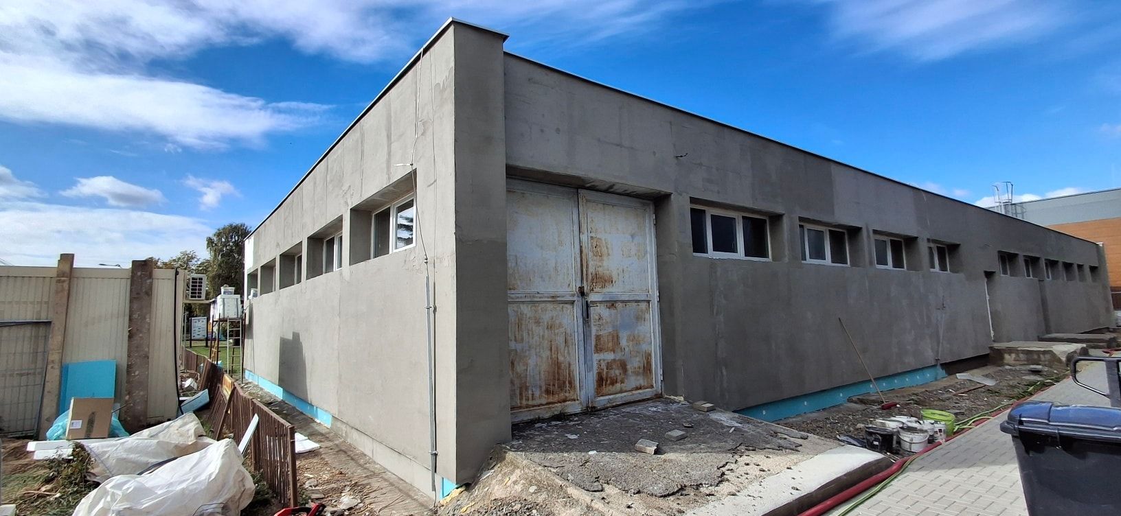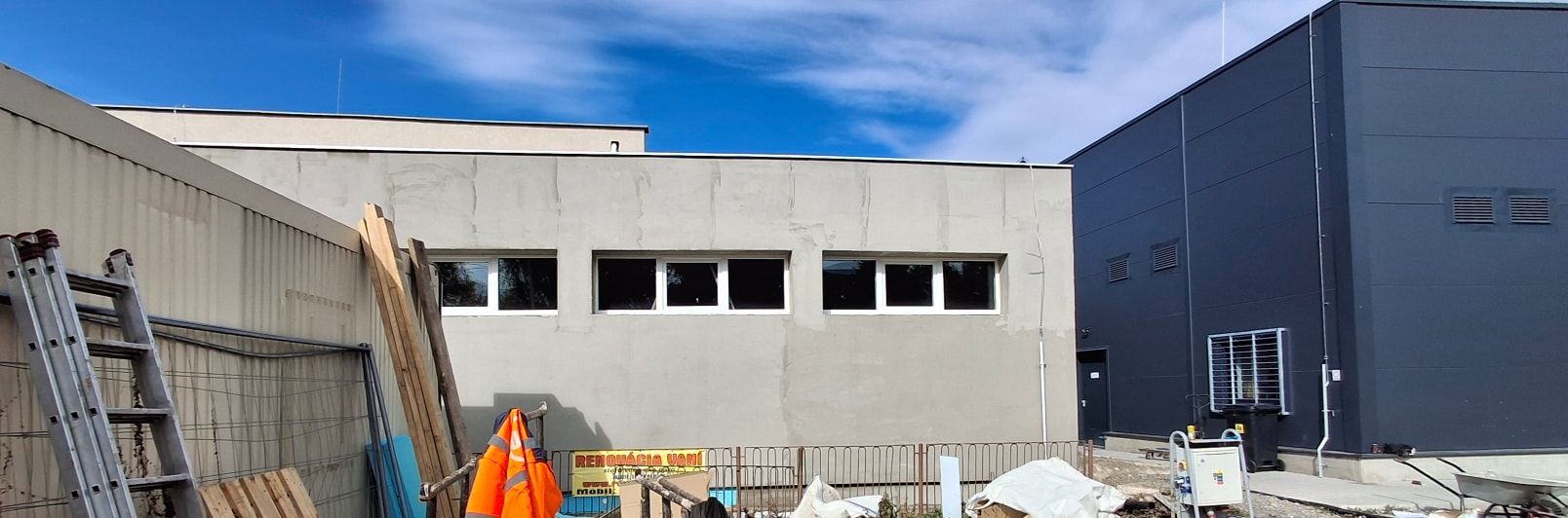 V týchto dňoch sa realizuje zateplenie a obnova fasády mestskej budovy so šatňovými priestormi, sociálnym zázemím a skladmi pri telocvični ZŠ na Komenského ulici spolu s obnovou chodníka v átriu Centra voľného času, ktorú financuje a zabezpečuje investor novovybudovaných priestorov neďalekého obchodného centra.
