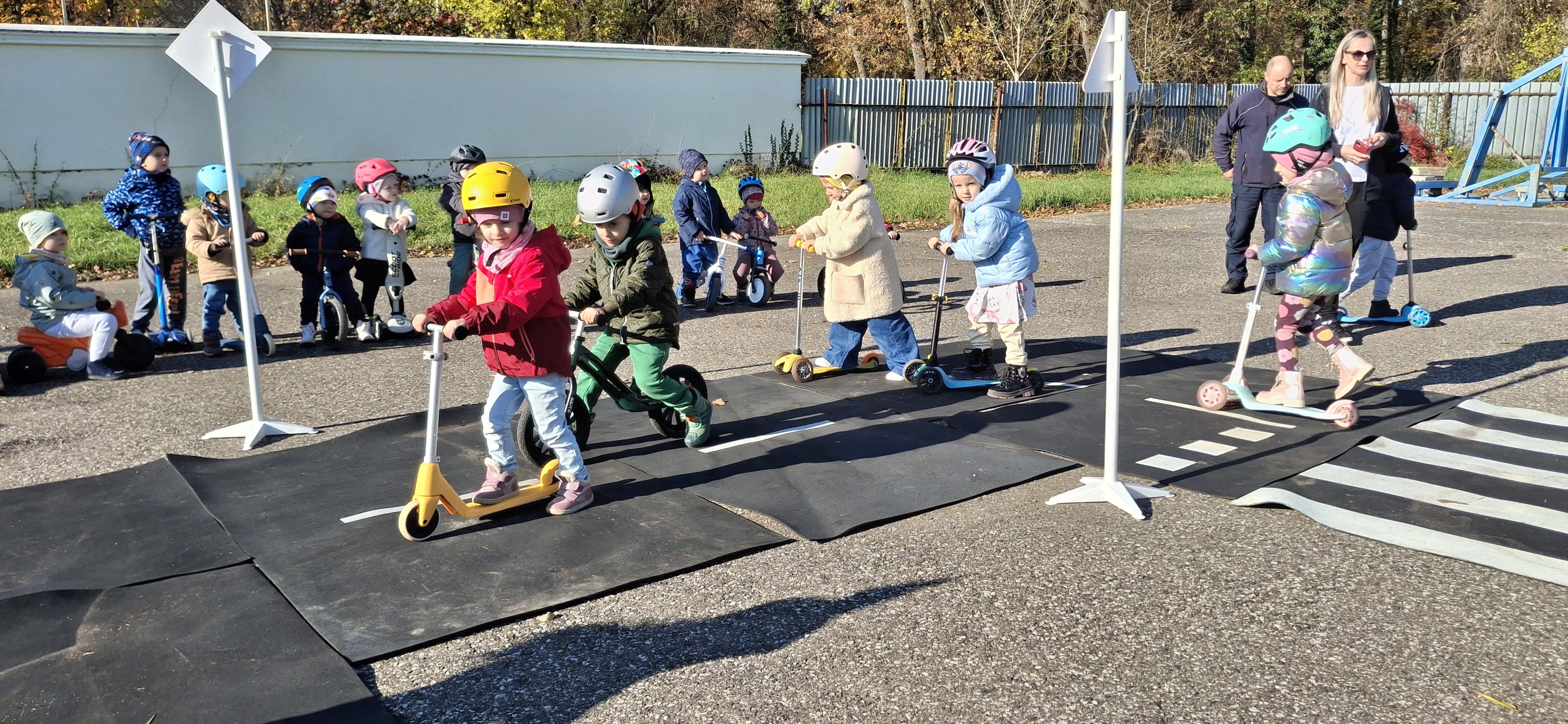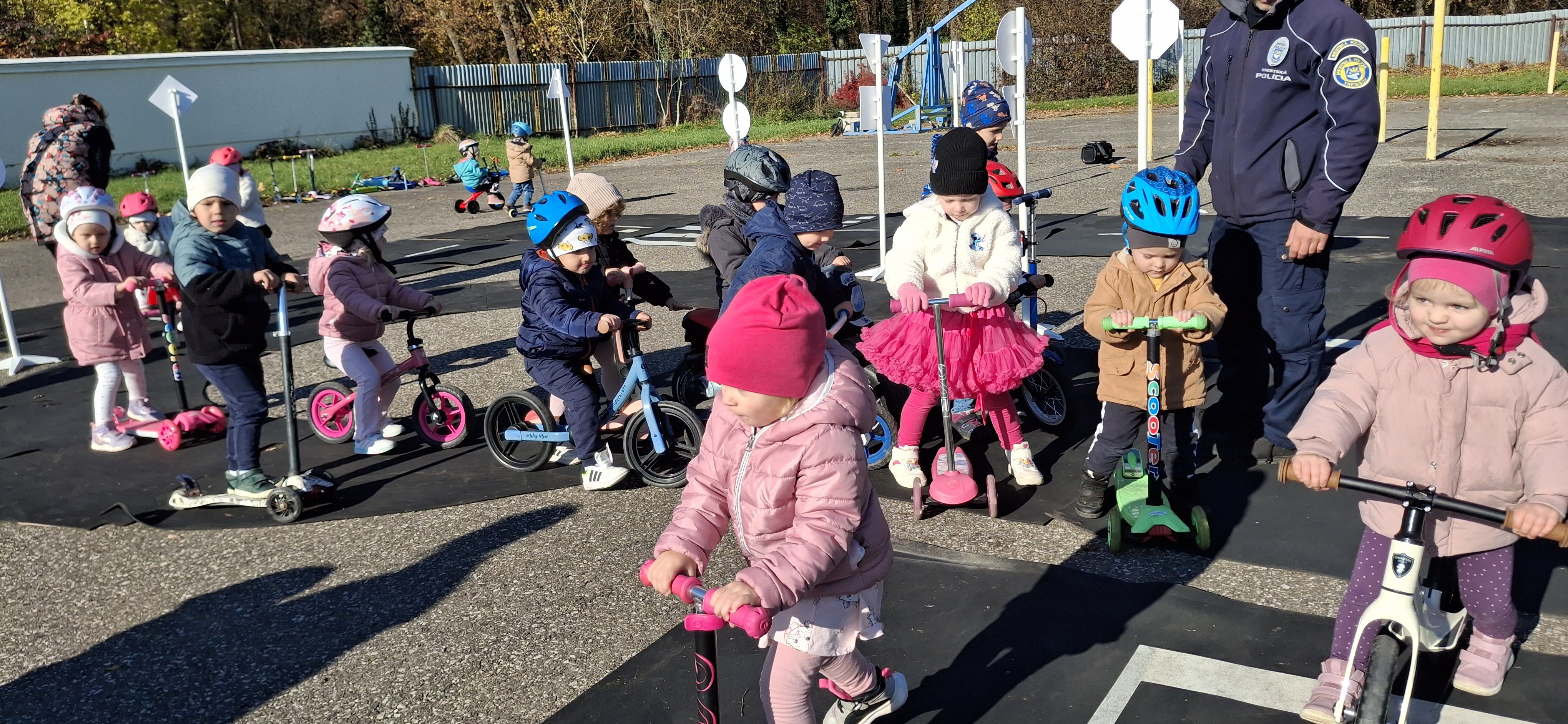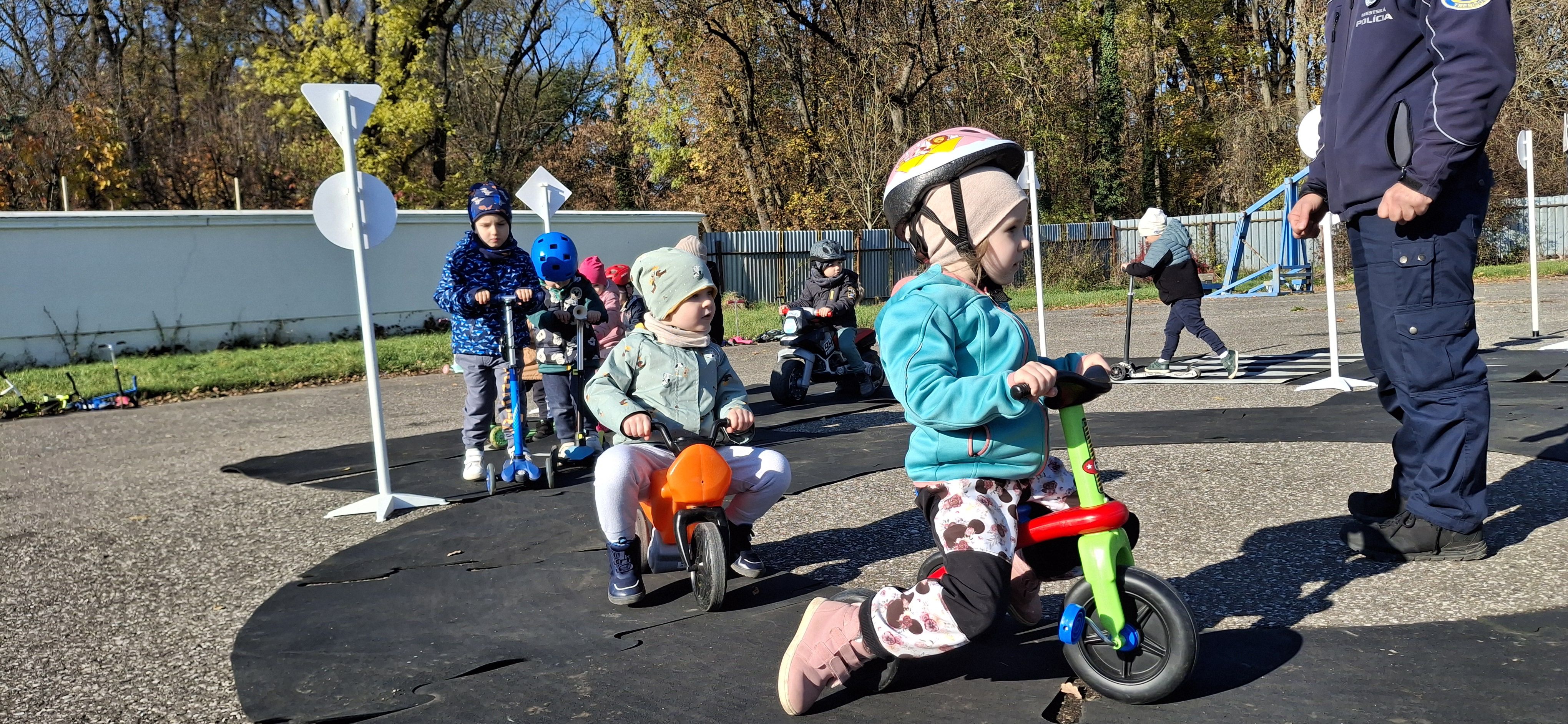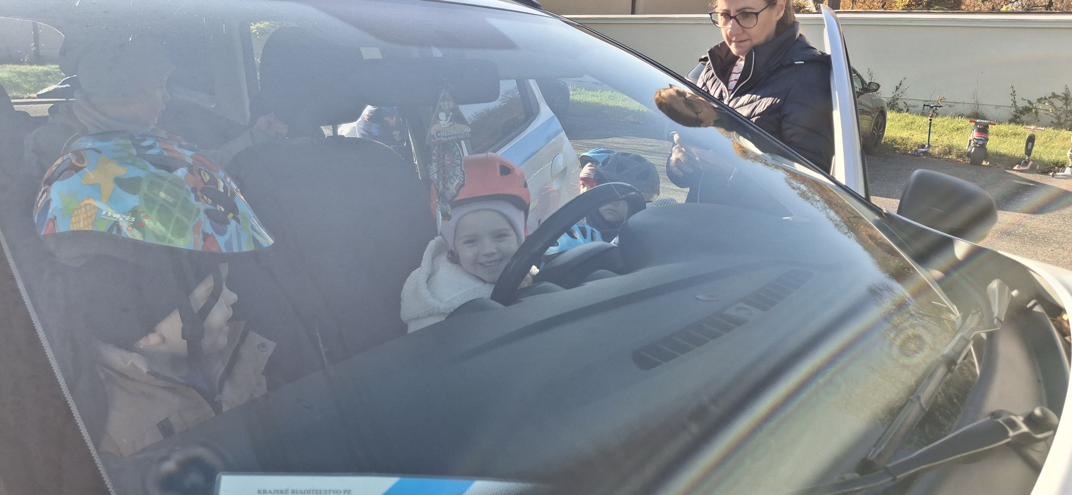Malí „vodiči“ si všetko hneď aj vyskúšali – jazdu na kolobežkách, odrážadlách a motorkách, rozpoznávanie dopravných značiek v praxi aj to, aké je to sedieť v policajnom aute.