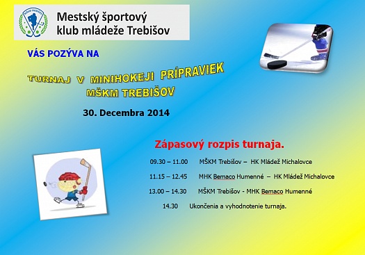 Mestský športový klub mládeže Trebišov Vás pozýva Turnaj v minihokeji prípravie, ktorý sa uskutoční 31.12.2014.