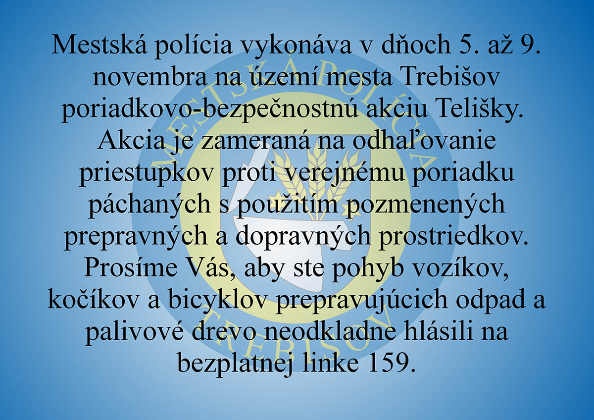 Mestská polícia vykonáva v dňoch 5. až 9. novembra na území mesta Trebišov poriadkovo-bezpečnostnú akciu Telišky. Akcia je zameraná na odhaľovanie priestupkov proti verejnému poriadku páchaných s použitím pozmenených prepravných a dopravných prostriedkov. Prosíme Vás, aby ste pohyb vozíkov, kočíkov a bicyklov prepravujúcich odpad a palivové drevo neodkladne hlásili na bezplatnej linke 159.