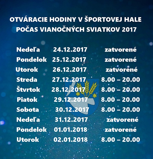 Otváracie hodiny športovej haly počas vianočných sviatkov a novoročných dní.
