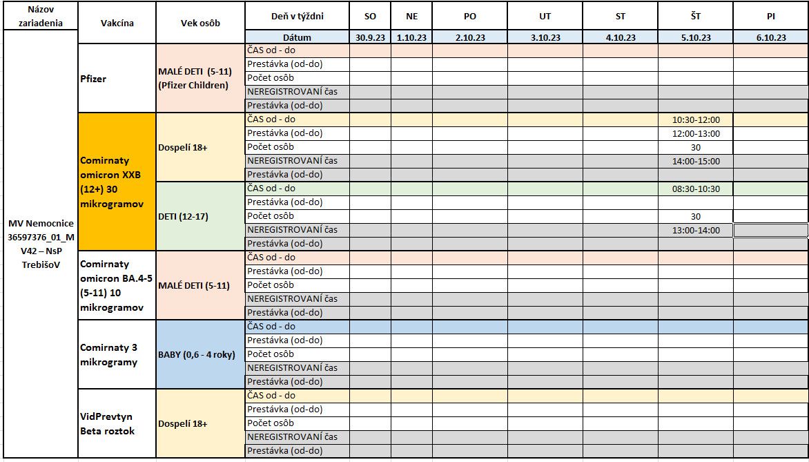 NsP Trebišov opätovne otvára vakcinačné centrum. Vzhľadom na neurčitý záujem a skúsenosti z predchádzajúceho očkovania, bude očkovanie zatiaľ 1x v týždni a následne, podľa záujmu ľudí, sa interval zníži alebo zvýši. Očkovanie bude prebiehať vo Vakcinačnom centre vo štvrtok (viď tabuľku) .