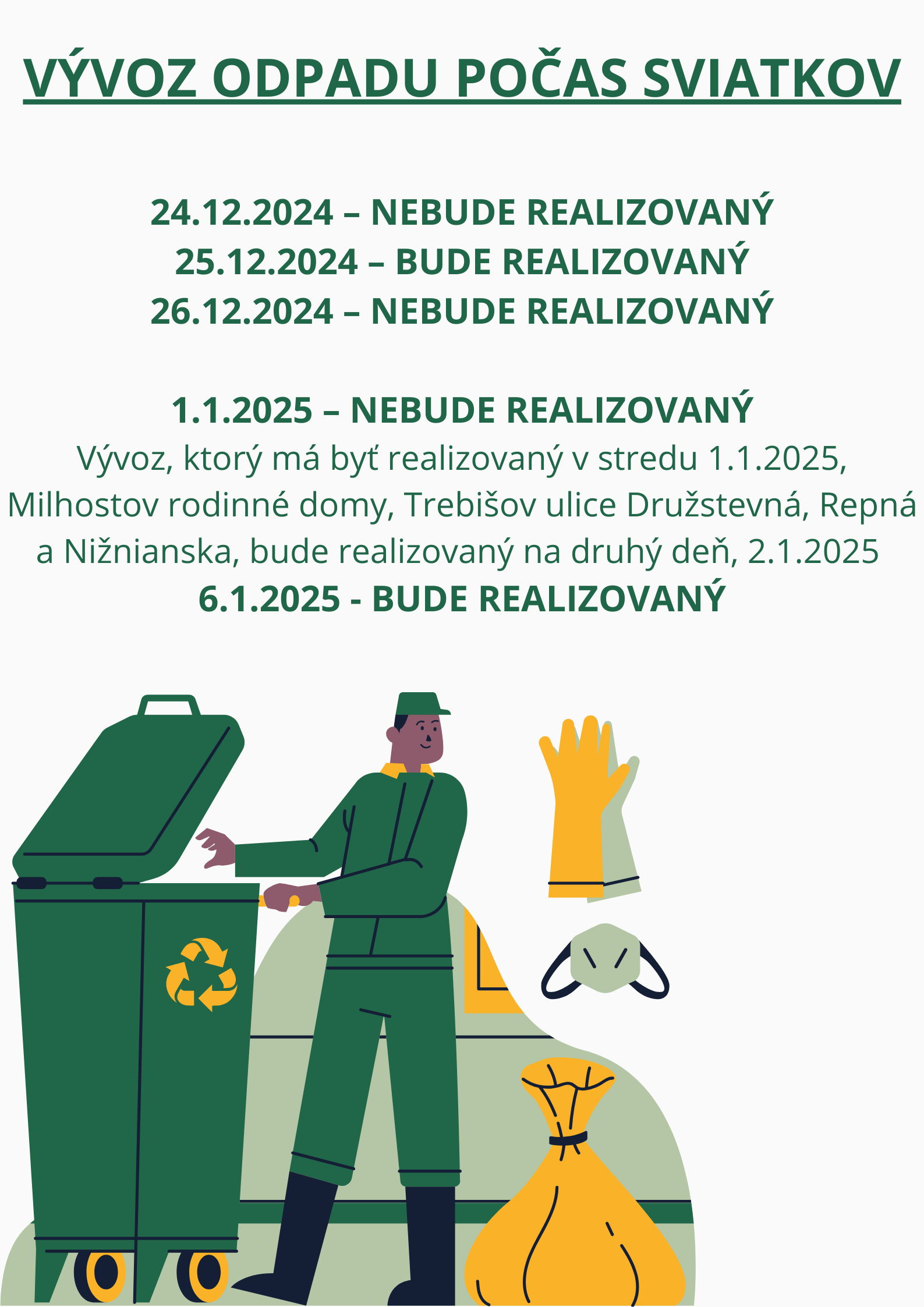 (vývoz, kt. má byť realizovaný v stredu 1.1.2025, tj: Milhostov rodinné domy, Trebišov ulice: Družstevná, Repná a Nižnianska – bude realizovaný na druhý deň, tj 2.1.2025)