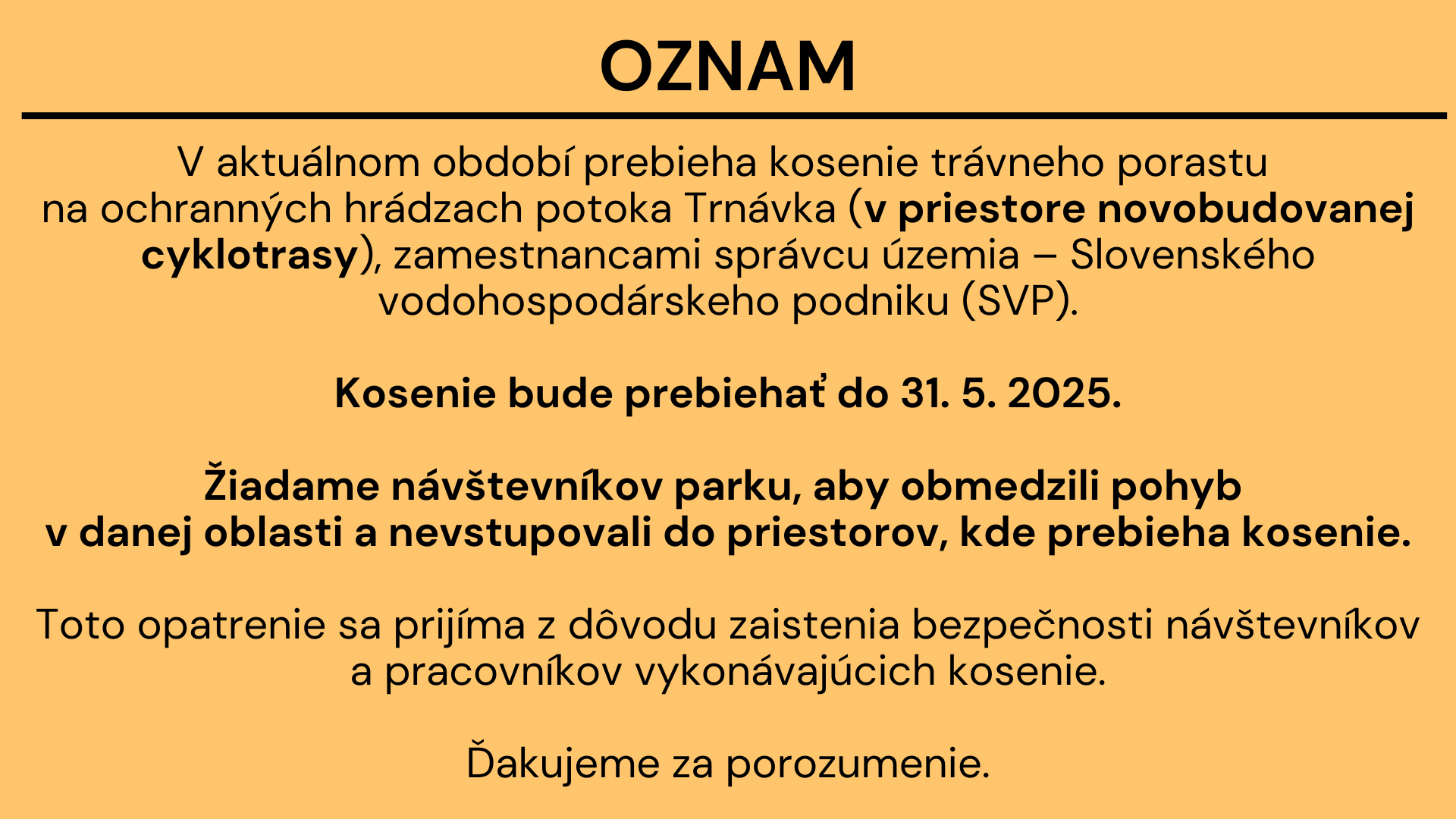 Toto opatrenie sa prijíma z dôvodu zaistenia bezpečnosti návštevníkov a pracovníkov vykonávajúcich kosenie.