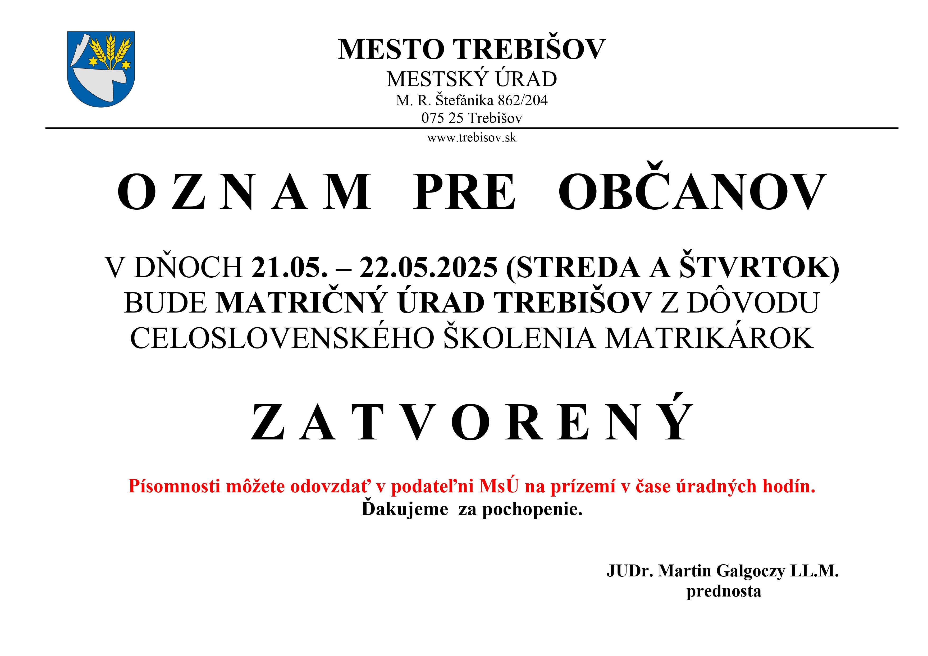 V DŇOCH 21.05. – 22.05.2025 (STREDA A ŠTVRTOK) BUDE MATRIČNÝ ÚRAD TREBIŠOV Z DÔVODU CELOSLOVENSKÉHO ŠKOLENIA MATRIKÁROK ZATVORENÝ.