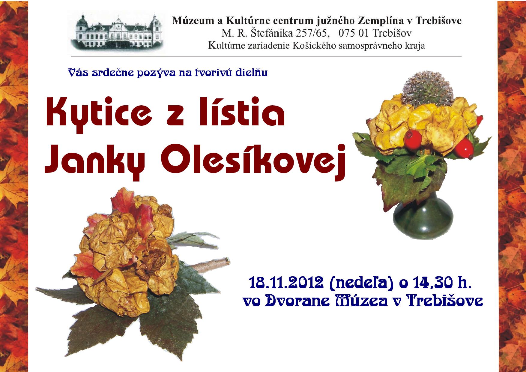 Srdečne Vás pozývame na tvorivú dielňu Janky Olesíkovej „Kytice z lístia“, ktorá sa uskutoční 18. novembra 2012 v čase od 14.30 do 17.00 hod. v trebišovskom kaštieli.
