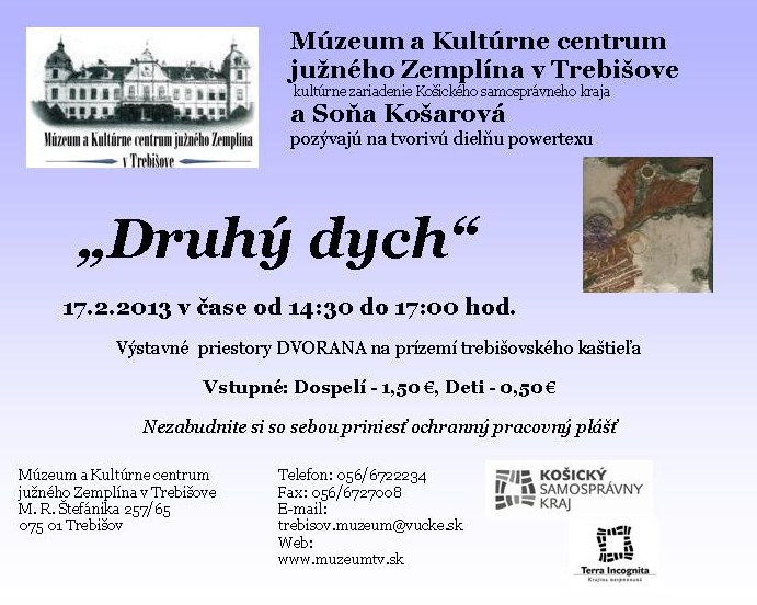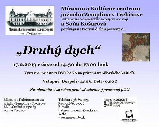 Múzeum a Kultúrne centrum južného Zemplína v Trebišove, kultúrne zariadenie Košického samosprávneho kraja, pozýva všetkých zručných priaznivcov tvorivých dielní na jednu z nich pod taktovkou Sone Košarovej s názvom „Druhý dych“, ktorá sa uskutoční 17. februára 2013 od 14:30 do 17:00 hod. vo výstavných priestoroch DVORANA na prízemí trebišovského kaštieľa. Nezabudnite si so sebou priniesť ochranný pracovný plášť a gukené rukavice.