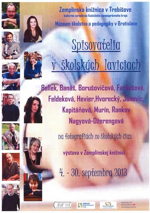 Výstava „Spisovatelia v školských laviciach“, ktorú nájdete v Zemplínskej knižnici v Trebišove, Vám ponúka možnosť spoznať dvanásť súčasných slovenských spisovateľov – L. Ballek, J. Banáš, E. Borušovičová, E. Farkašová, O. Feldeková, D. Hevier, M. Hvorecký, T. Janovic, D. Kapitáňová, Š. Murín, P. Nagyová-Džerengová a P. Rankov, ktorí si spomínajú na svoje školské časy, spolužiakov, pedagógov, ale aj predmety, ktoré nemali v láske, či ktoré boli ich obľúbené. Aj oni kedysi dreli školské lavice a lámali si hlavy nad písmenkami v šlabikároch.