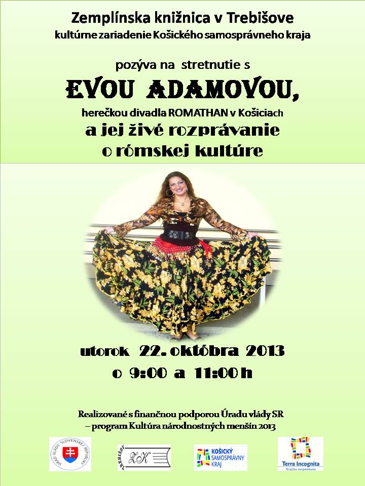 Živé rozprávanie o rómskej kultúre s herečkou divadla ROMATHAN Evou ADAMOVOU ponúka Zemplínska knižnica v Trebišove 22. októbra 2013 o 9.00 h a 11.00 h.