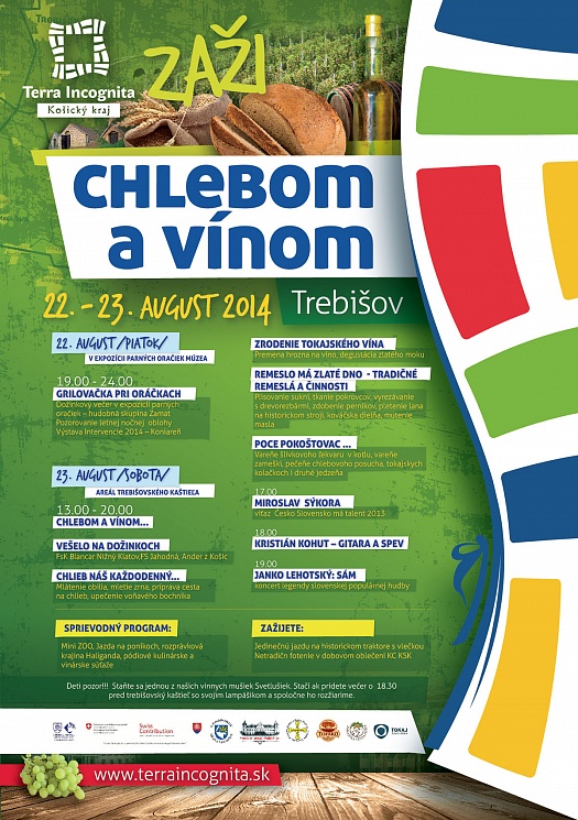 Múzeum a Kultúrne centrum južného Zemplína Vás pozýva na podujatie Chlebom a vínom, ktoré sa uskutoční 23. augusta 2014 v areáli trebišovského kaštieľa. Deň predtým, 22. augusta 2014, od 19.00 h bude Grilovačka pri oračkách.