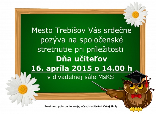 Mesto Trebišov srdečne pozýva učiteľov ZŠ a MŠ na spoločenské stretnutie pri príležitosti Dňa učiteľov 16. apríla 2015 o 14.00 h v divadelnej sále MsKS v Trebišove.