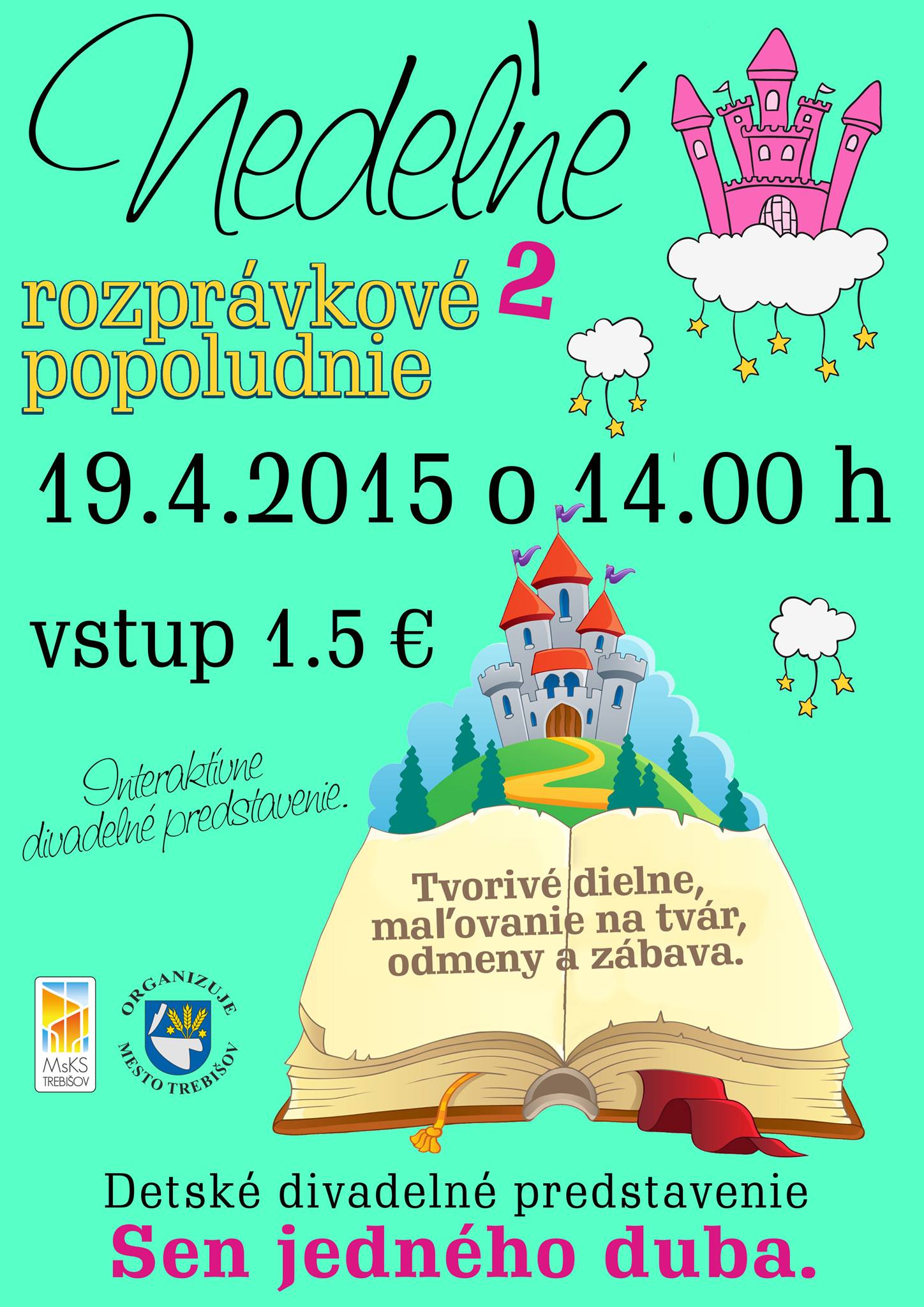Nedeľné rozprávkové popoludnie - detské divadelné predstavenie Sen jedného duba 19.4.2015 o 14.00 h v MsKS v Trebišove. Vstupné 1,5 €.