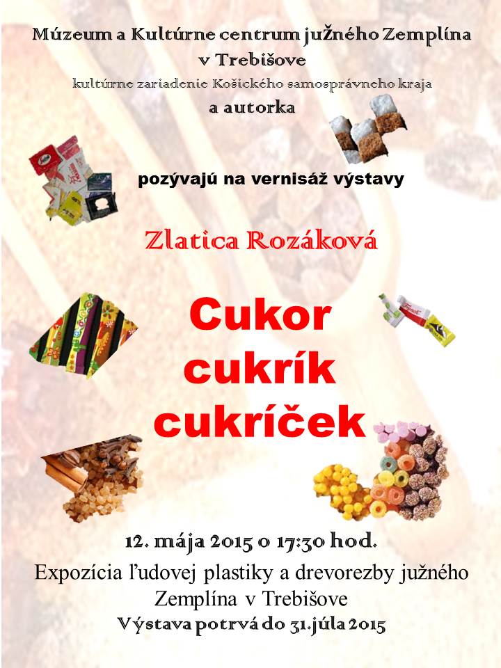 Múzeum a Kultúrne centrum južného Zemplína v Trebišove pozýva na výstavu Zlatice Rozákovej „Cukor - cukrík - cukríček“, ktorá sa uskutoční 12.mája 2015 o 17:30 h v Expozícii ľudovej plastiky a drevorezby južného Zemplína.