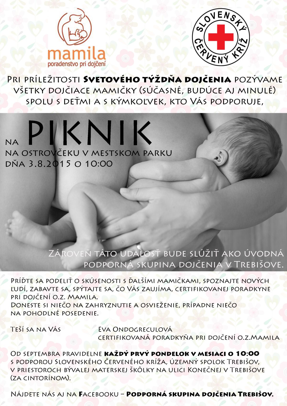Občianske združenie MAMILA s podporou Slovenského červeného kríža, územného spolku Trebišov a mesta Trebišov organizujú stretnutie certifikovanej poradkyne pri dojčení O.Z. Mamila s dojčiacimi mamičkami, ich deťmi a s kýmkoľvek, koho daná téma zaujíma. Stretnutie pod názvom PIKNIK sa uskutoční na ostrovčeku v mestskom parku 3. augusta 2015 o 10:00 h.