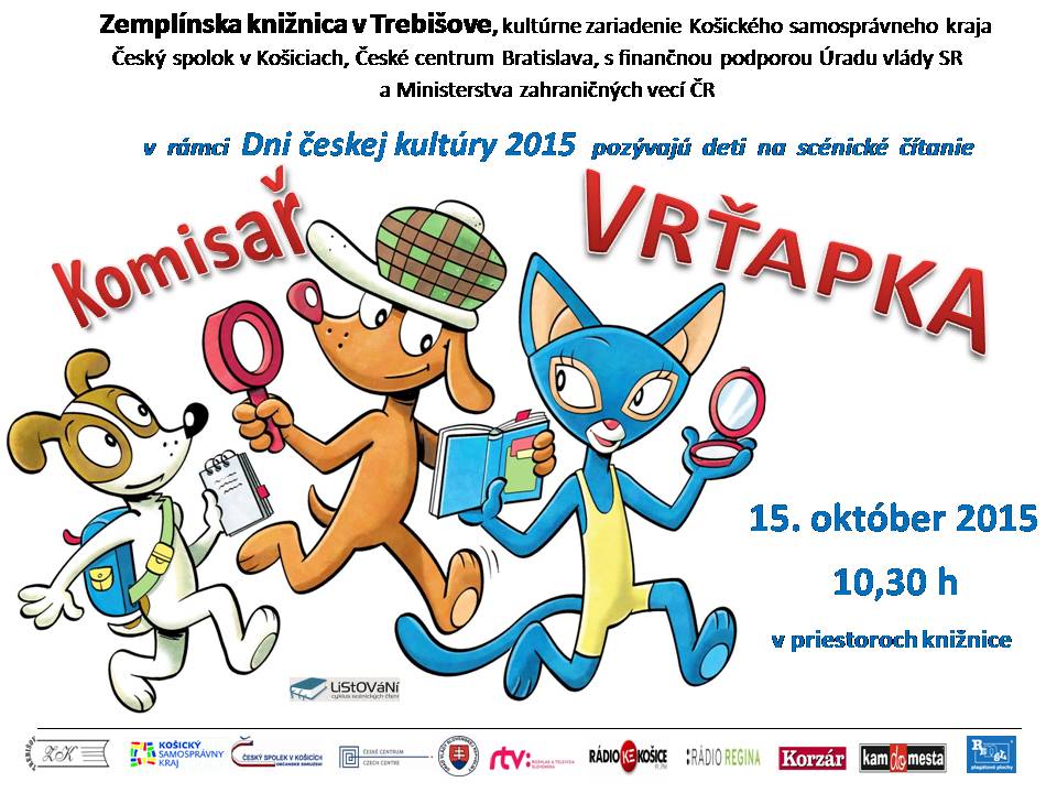 Zemplínska knižnica v Trebišove v spolupráci s Českým spolkom v Košiciach a Českým centrom v Bratislave, pozýva deti na scénické čítanie „Komisař Vrťapka“, ktoré organizuje v rámci Dni českej kultúry vo štvrtok 15. októbra 2015 o 10.30 h v priestoroch knižnice.