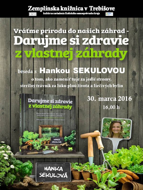 Ak hľadáte inšpiráciu pre vlastnú záhradu, ktorá chcete aby bola v súlade s prírodnými zákonmi a aby v nej vládla harmónia a prirodzená krása, príďte 30. marca 2016 o 16.00 h do Zemplínskej knižnica v Trebišove na besedu s Hankou SEKULOVOU a tu sa dozviete, okrem iného aj o tom, ako zameniť tuje za jedlé stromy, či sterilný trávnik za lúku plnú života a liečivých bylín.