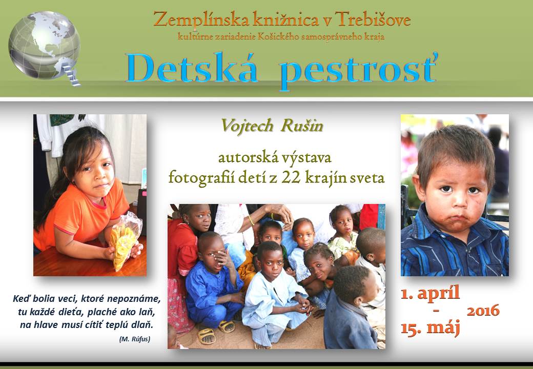 Výstava fotografií detí z 22 krajín sveta autora Vojtecha RUŠINA v priestoroch Zemplínskej knižnice v Trebišove od 1. apríla do 15. mája 2016.