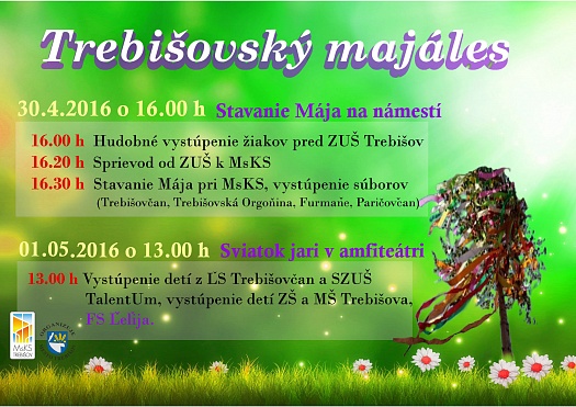 S prichádzajúcimi oslavami Sviatku práce pripravuje mesto Trebišov spoločenské stretnutie s pekným kultúrnym programom, ktoré sa uskutoční 30.4. a 1.5.2016. Atmosféra podujatia sa ponesie v ľudovom duchu. Nebudú chýbať vystúpenia detí a žiakov základnej umeleckej školy, a samozrejme, aj piesne a tance miestnych folklórnych zoskupení. Ako je známe z tradícií, v predvečer sviatočného dňa bude postavený „Máj“.