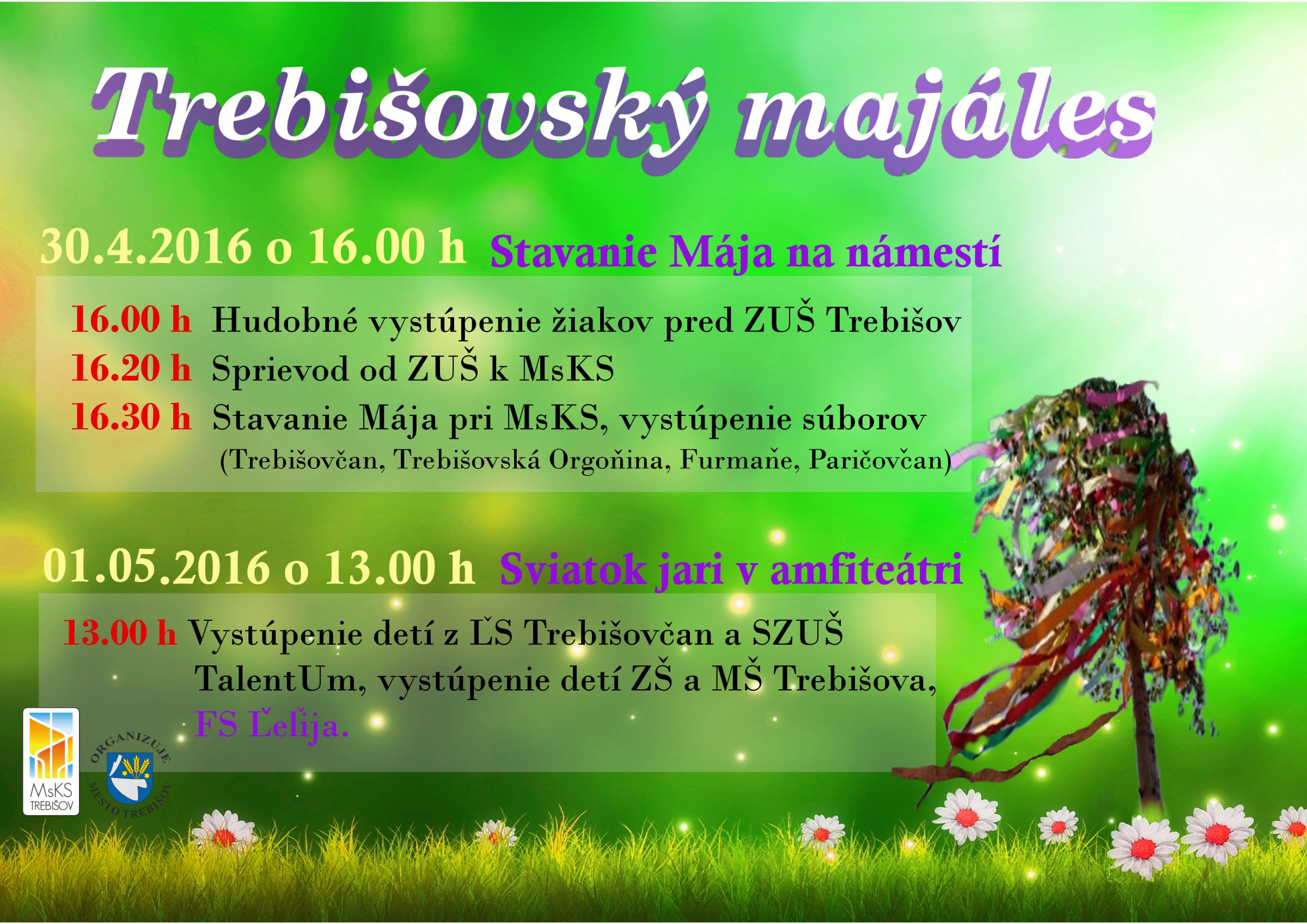 Program začne o 16.00 h pred ZUŠ v Trebišove hudobným vystúpením žiakov školy. Po ňom bude nasledovať, ako je u nás zvykom, zdobenie „Mája“ - mladého stromčeka. Postarajú sa o to žiaci ZUŠ a domáci folkloristi. Následným sprievodom sa účastní občania, folkloristi a účinkujúce deti presunú pred Mestské kultúrne stredisko, kde sa postaví a upevní na pripravené miesto vyzdobený „Máj“. V kultúrnom programe sa postupne predstavia ľudový súbor Trebišovčan a folklórne skupiny: Trebišovská Orgoňina, Furmaňe a Paričovčan.