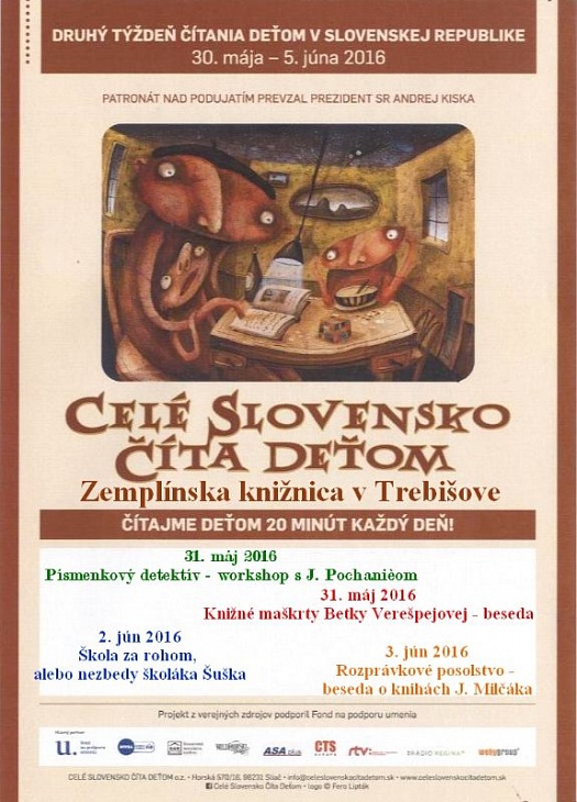 Aj Zemplínska knižnica v Trebišove sa zapája do celoslovenského projektu čítania deťom. Začíname počas minifestivalového dňa 31. mája, pokračujeme 2. a 3. júna 2016. Na každý deň máme pripravené iné, zaujímavé čítanie so známymi i neznámymi ľuďmi - spisovateľmi Jánom Pochaničom a Betkou Verešpejovou, učiteľkami, knihovníčkami, rodičmi, starými rodičmi, čitateľmi knižnice.