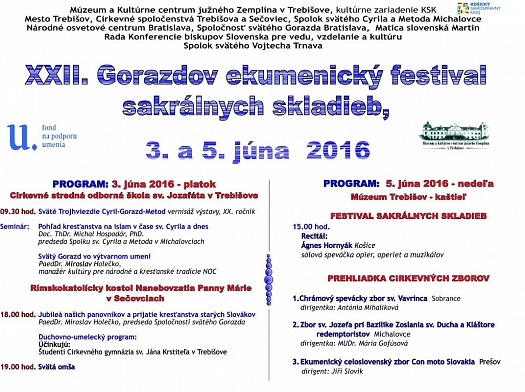 Múzeum a Kultúrne centrum južného Zemplína v Trebišove v spolupráci s ďalšími organizátormi pripravujú už XXII. ročník Gorazdovho ekumenického festivalu sakrálnych skladieb, ktorý sa uskutoční 3. a 5. júna 2016.
