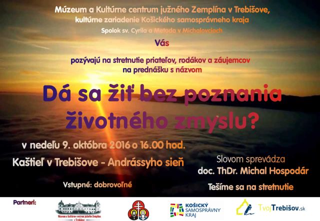 Múzeum a Kultúrne centrum južného Zemplína v Trebišove v spolupráci so Spolkom sv. Cyrila a Metoda v Michalovciach pripravujú prednášku pre širokú verejnosť so záujmom o duchovnú tematiku.Témou stretnutia „Dá sa žiť bez poznania životného zmyslu?“ posprevádza návštevníkov trebišovského múzeu o. doc. ThDr. Michal Hospodár PhD., predseda Spolku sv. Cyrila a Metoda.