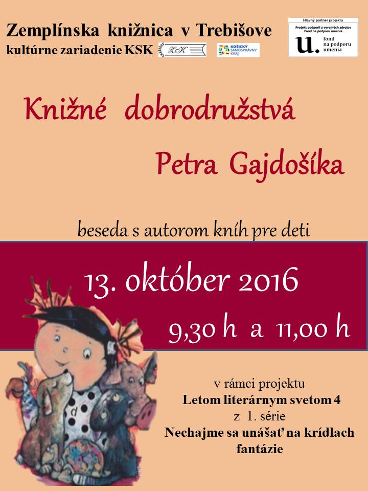 Peter GAJDOŠÍK, spisovateľ pre deti, pricestuje z Lučenca do Zemplínskej knižnice v Trebišove 13. októbra 2016 na besedu o svojich knihách, ktoré napísal pre všetky deti. Stretnutie so spisovateľom sa uskutoční v knižnici o 9:30 h a 11:00 h.