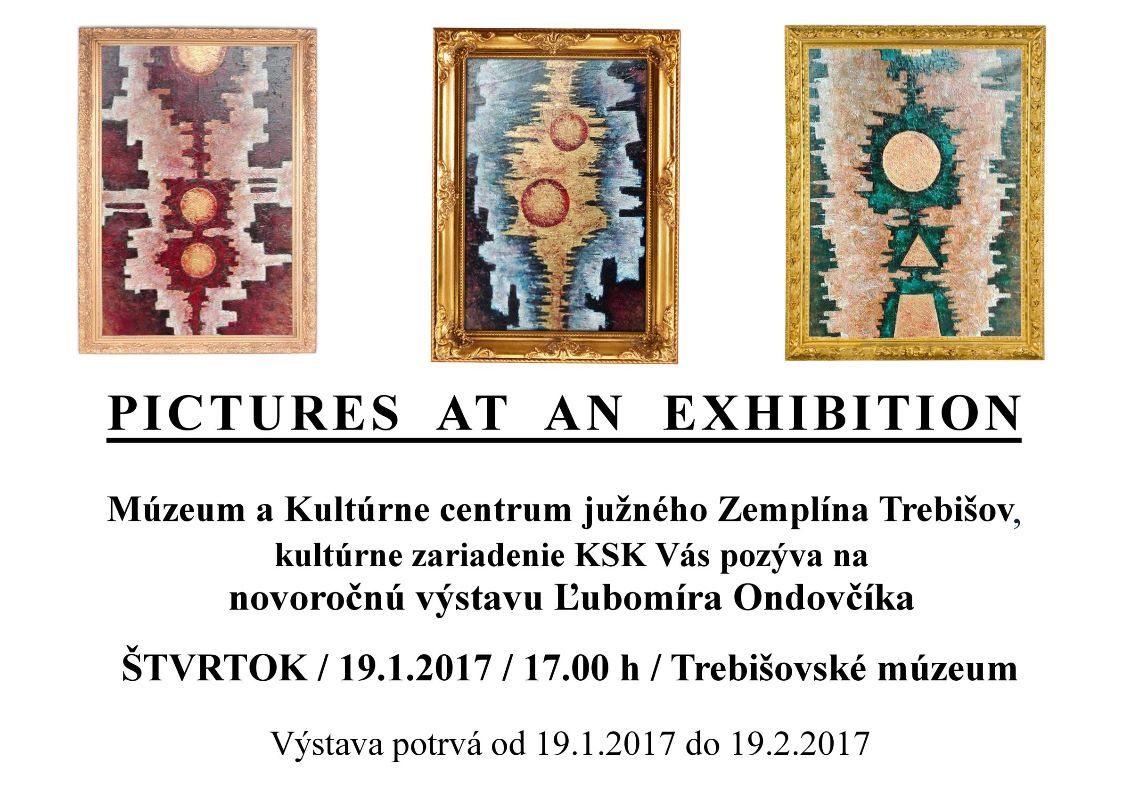 Umelec Ľubomír Ondovčík, člen Trebišovského umeleckého klubu, otvorí výstavu svojich umeleckých diel Pictures at an exhibition štvrtok 19. januára 2017 vo výstavných priestoroch na prízemí trebišovského kaštieľa, sídla kultúrneho zariadenia Košického samosprávneho kraja.