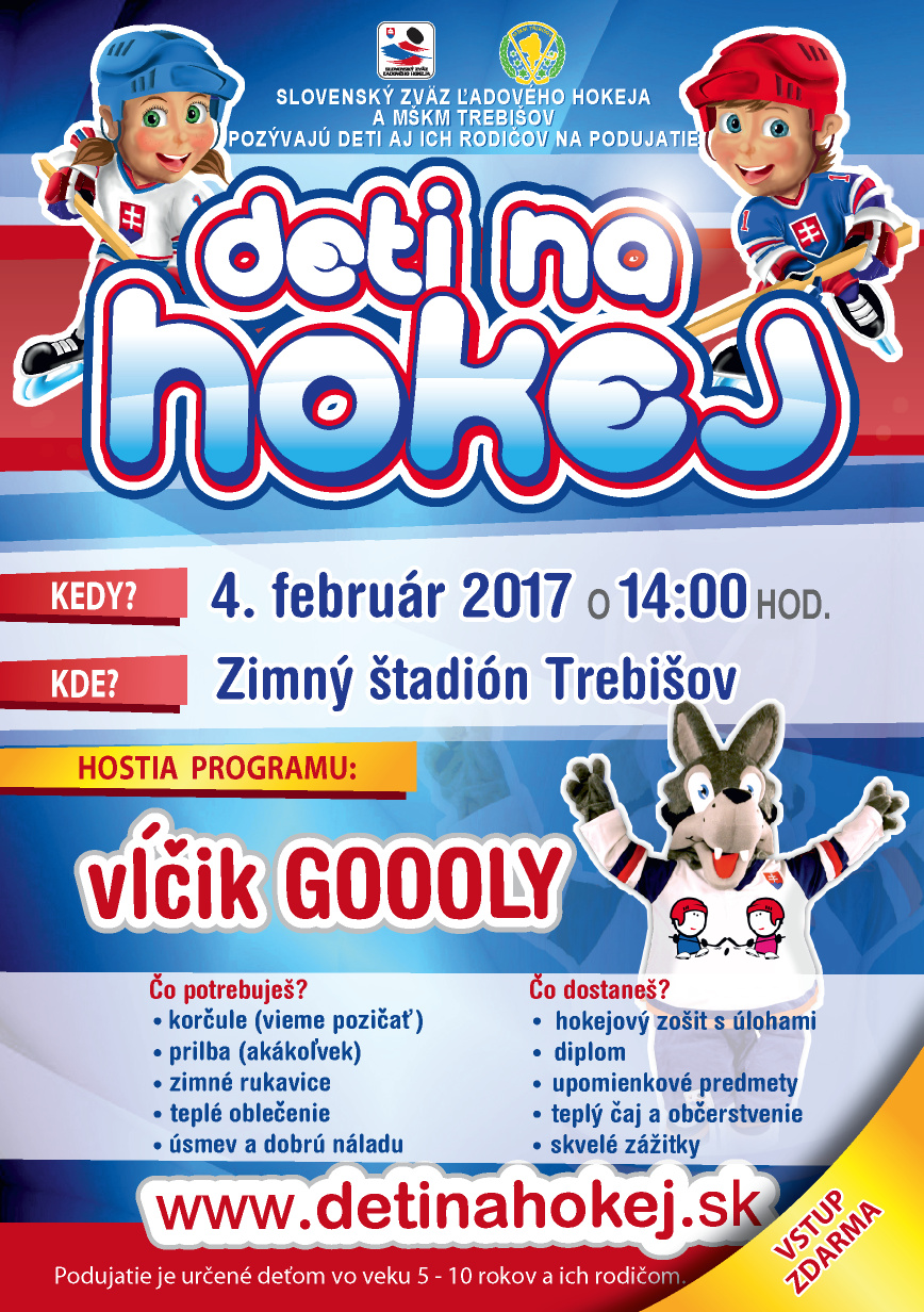 Projekt DETI NA HOKEJ, po úspešnom pilotnom ročníku, pokračuje sériou 36 podujatí vo viacerých mestách Slovenska. Na zimnom štadióne v Trebišove sa uskutoční sobotu 4. februára 2017 o 14.00 hodine. Na deti sa už teší aj maskot Goooly.