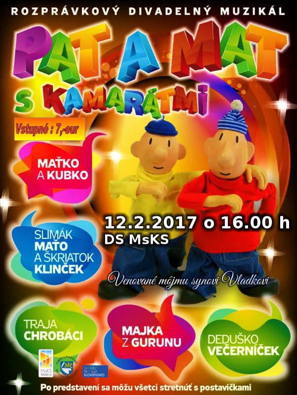 Predstavenie pre deti sa uskutoční 12.2.2017 (nedeľa) o 16.00 h v divadelnej sále MsKS.