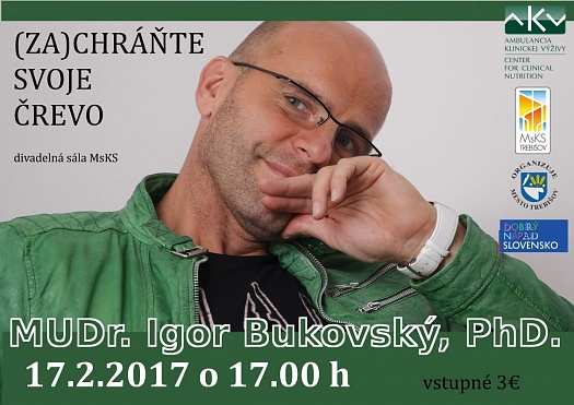 MUDr. Igor Bukovský, PhD. je slovenský lekár, ktorý sa od roku 1992 venuje otázkam výživy a trendom v oblasti zdraviu prospešnej životosprávy. Mediálne známy dr. Bukovský, ktorý sa už 25 rokov venuje tejto téme, navštívi Trebišovčanov a bude im radiť. Ako tému svojej prednášky si zvolil (Za)chráňte svoje črevo.