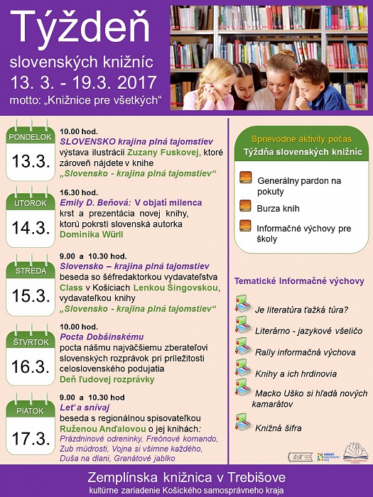 Zemplínska knižnica v Trebišove pri tejto príležitosti opäť pripravila pre svojich priaznivcov - čitateľov, používateľov služieb i návštevníkov zaujímavý program, ktorý Vám ponúkame a ktorým chceme spríjemniť Váš voľný čas i chvíle strávené u nás v knižnici.