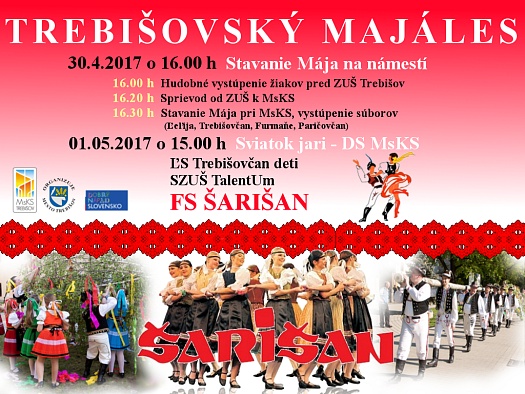 Program začne o 16.00 h pred ZUŠ v Trebišove hudobným vystúpením žiakov školy. Po ňom bude nasledovať, ako je v regióne zvykom, zdobenie „Mája“ - mladého stromčeka. Farebnými stuhami budú stromček zdobiť žiaci ZUŠ a trebišovskí folkloristi. Nasledovať bude sprievod prítomných ľudí, folkloristov a účinkujúcich detí, ktorí sa presunú pred budovu Mestského kultúrneho strediska, kde sa postaví a upevní na pripravené miesto vyzdobený „Máj“. V kultúrnom programe postupne vystúpia folklórne skupiny: Furmaňe, Paričovčan a dva folklórne súbory: Ľeľija a Trebišovčan.