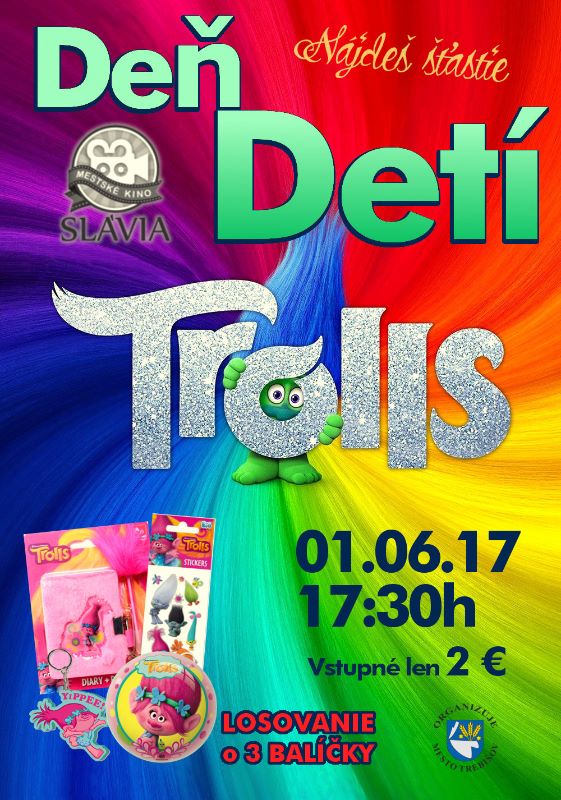 Film pre deti bude premietaný štvrtok 1. júna 2017 o 17:30 h za zvýhodnenú cenu - 2 €. Mladí diváci sa môžu tešiť na výherné balíčky s prezentmi, ktoré im budú Trollov jednoznačne pripomínať. Svoje výherné šťastie nájdu priamo v kinosále.