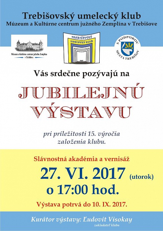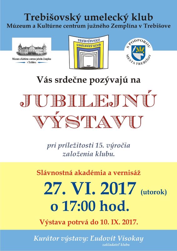 Trebišovský umelecký klub, Múzeum a Kultúrne centrum južného Zemplína v Trebišove s podporou mesta Trebišov pripravujú Jubilejnú výstavu, ktorá sa uskutoční pri príležitosti 15. výročia založenia klubu.