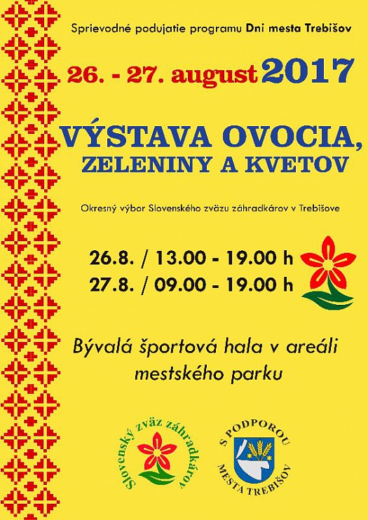 Jedným zo sprievodných podujatí Dni mesta Trebišov 2017 bude Výstava ovocia, zeleniny a kvetov, ktorú môžu záujemcovia prísť obdivovať v sobotu 27.8. aj nedeľu 28.8. do budovy Správy parku (bývalá športová hala v parku). Jednotliví účastníci výstavy, členovia Okresného výboru Slovenského zväzu záhradkárov v Trebišove, na nej odprezentujú výsledky prác svojich rúk.