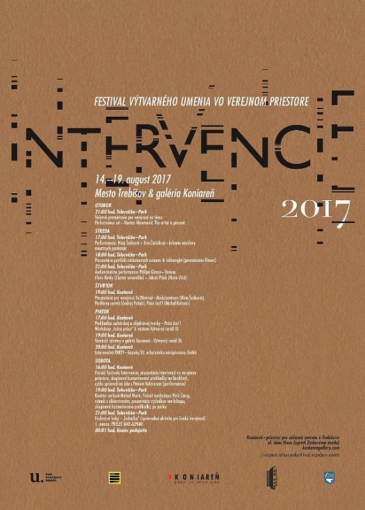 „Intervencie 2017 je už v poradí 6. ročník výtvarného sympózia zameraného na verejný priestor. Snahou podujatia nie je estetizovať alebo skrášľovať mestské prostredie. Výtvarné umenie je nástrojom skúmania povahy verejného priestoru, jeho kvalít, špecifík, daností a možností. Do istej miery je to projekt občianskeho aktivizmu, uzurpácie si práva zaujať verejný priestor, na ktorý majú občania nespochybniteľný nárok. Intervencie sú preto niečo ako výtvarné laboratórium, ktoré poskytuje priestor pre slobodnú tvorbu reagujúcu na konkrétne problémy mesta a miesta, vzťahu verejné-súkromné priestranstvá, postavenie umeleckých artefaktov vo verejnom priestore, využívanie verejného priestoru obyvateľmi, ich návyky vo vzťahu k verejnému priestoru, budovám, ale aj na sociálne návyky obyvateľov využívajúcich verejné priestranstvá.“ Peter Valiska Timečko