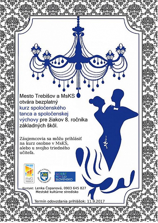 Mesto Trebišov v spolupráci s lektorkou tanca otvorí ďalší bezplatný kurz spoločenského tanca a spoločenskej výchovy. Kurz je venovaný žiakom 8. ročníka ZŠ. Prihlásiť sa naň je možné priamo v MsKS alebo u triednych učiteľov na základných školách v meste. Prihlášku odovzdajte najneskôr 11. septembra 2017.
