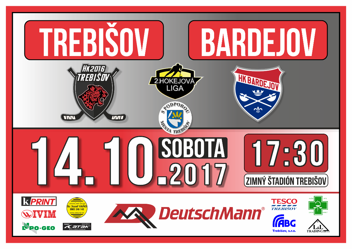 Sobotu 14.10.2017 o 17:30 h sa uskutoční hokejový zápas II. ligy medzi HK 2016 Trebišov a HK Bardejov na Zimnom štadióne v Trebišove.