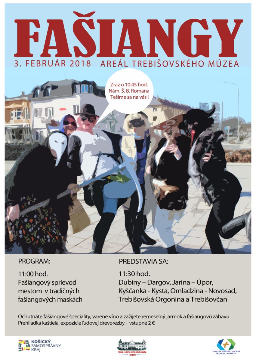 Fašiangový sprievod v tradičných maskách začne na Námestí Š. B. Romana v Trebišove sobotu 3. februára o 11.00 hod. smerom ku kaštieľu. Program bude pokračovať o 11.30 h priamo v jeho areáli. Gurmánov potešia fašiangové špeciality, nebude chýbať ani varené vínko. Návštevníci zažijú remeselný jarmok a pravú fašiangovú zábavu. O dobrú náladu sa postarajú folklórne skupiny Dubiny – Dargov, Jarina – Úpor, Kyščanka - Kysta, Omladzina - Novosad, Trebišovská Orgonina a FS Trebišovčan.