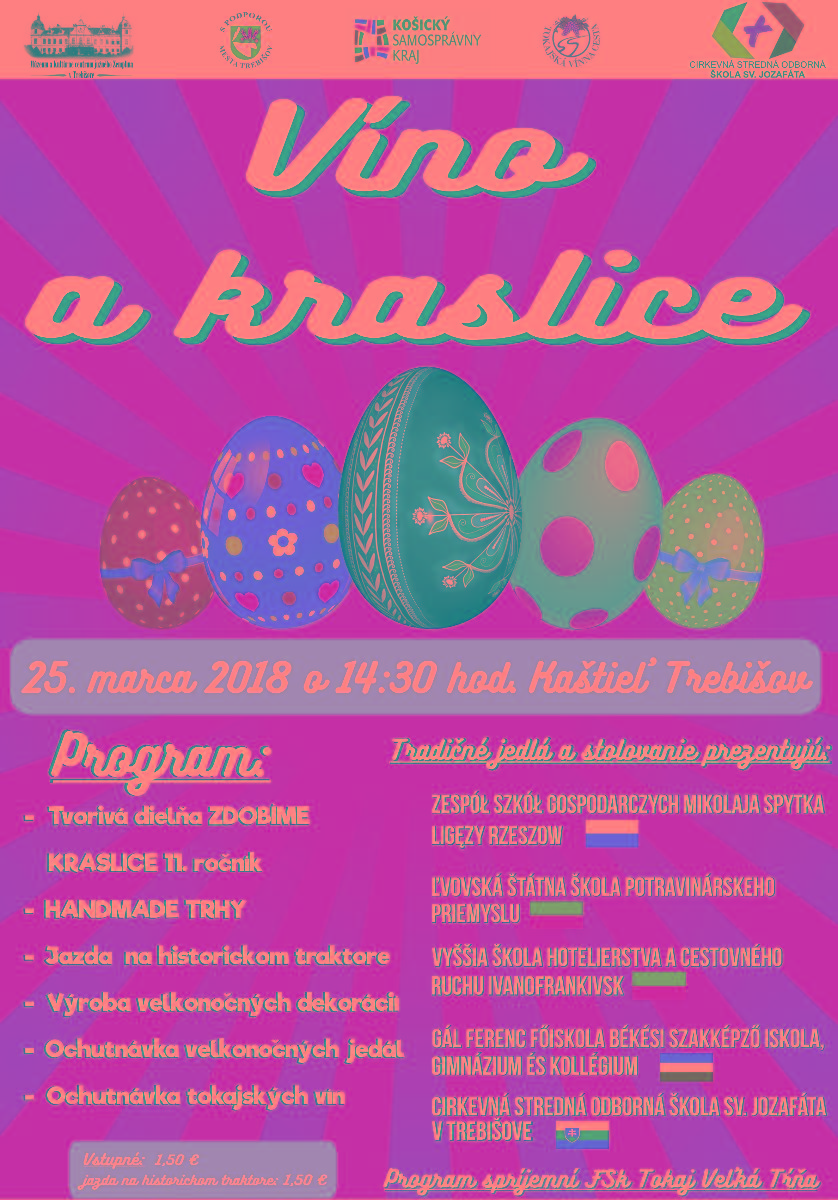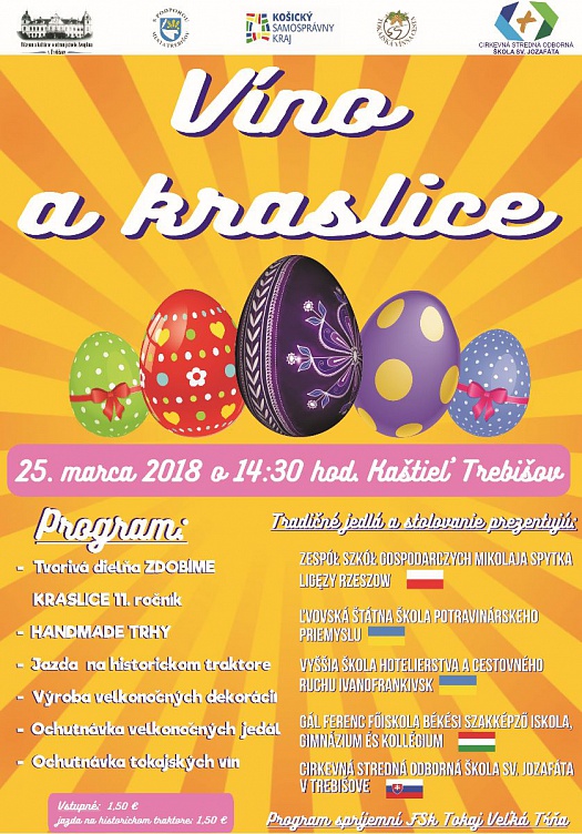 Múzeum a Kultúrne centrum južného Zemplína v Trebišove, kultúrne zariadenie Košického samosprávneho kraja, Mesto Trebišov, CSOŠ sv. Jozafáta pripravujú na tohtoročnú Kvetnú nedeľu 25. marca 2018 v čase od 14.30 hod. tradičné veľkonočné podujatie s názvom VÍNO A KRASLICE. Kultúrno-spoločenské podujatie sa uskutoční s podporou hlavných partnerov, ktorými sú Mesto Trebišov, Združenie Tokajská vínna cesta a Cirkevná stredná odborná škola sv. Jozafáta v Trebišove.