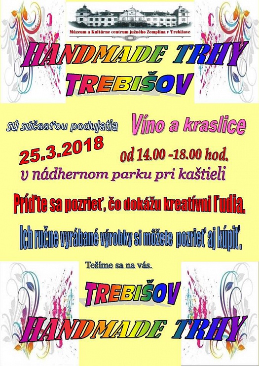 Návštevníci trebišovského kaštieľa sa môžu tešiť na bohatý program, v ktorom nebude chýbať tvorivá dielňa v zdobení veľkonočných kraslíc, jazda na historickom traktore, výroba veľkonočných dekorácií, handmade trhy, ochutnávka veľkonočných jedál a ochutnávka tokajských vín.