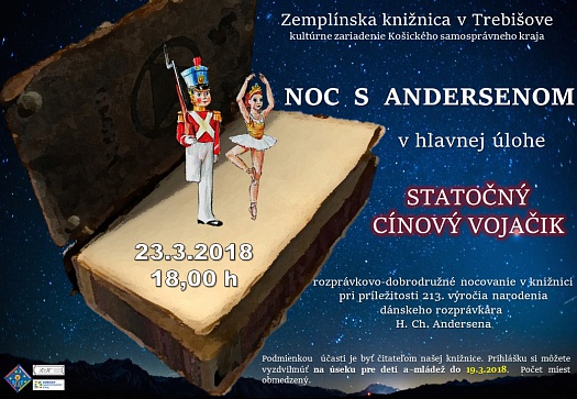 Svoju dlhoročnú tradíciu má Noc s Andersenom aj v Zemplínskej knižnici v Trebišove, v tomto roku to bude už po 12-ty krát. Znova pozývame deti stráviť jednu noc bez rodičov a súrodencov v knižnici, získať nových kamarátov a nové zážitky.