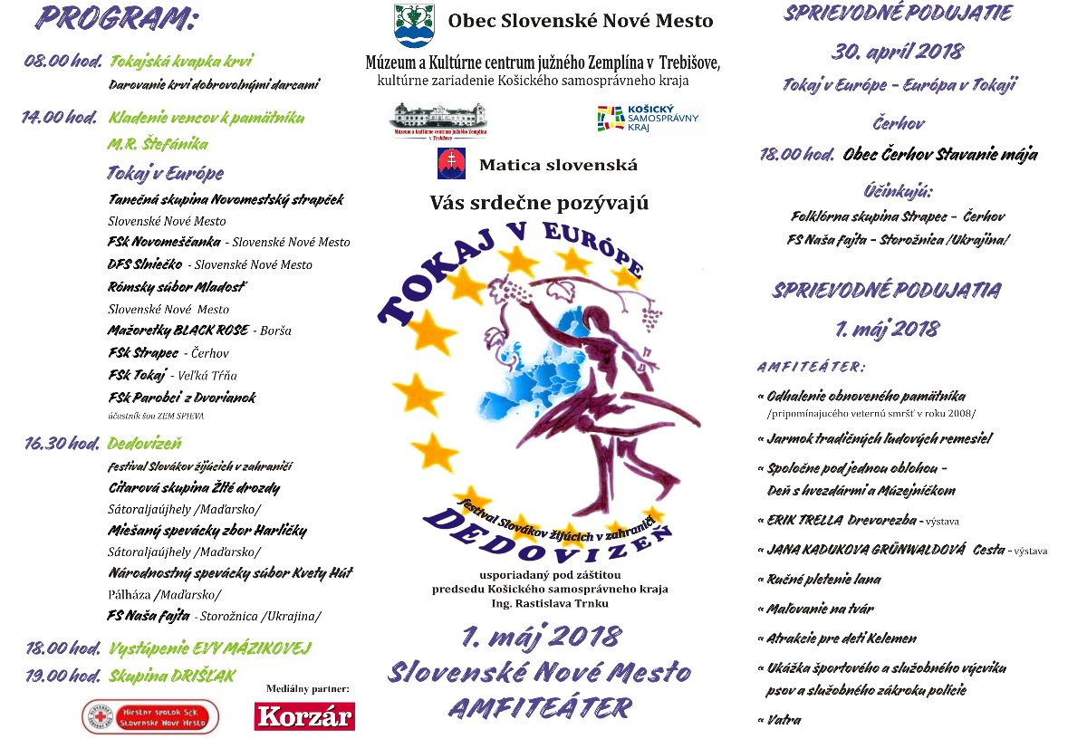 Slovenské Nové Mesto, Múzeum a Kultúrne centrum južného Zemplína v Trebišove a Matica slovenská pripravujú podujatie Tokaj v Európe a Dedovizeň - festival Slovákov žijúcich v zahraničí, ktoré sa uskutoční 1. mája v amfiteátri Slovenského Nového Mesta.