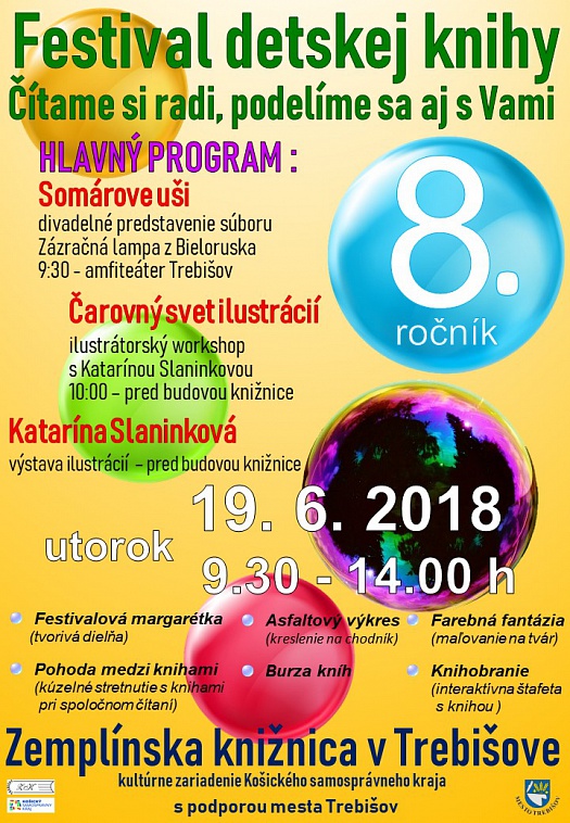 8. ročník festivalu detskej knihy „Čítame si radi, podelíme sa aj s Vami“ bude v Zemplínskej knižnici v Trebišove prebiehať v utorok, 19. júna 2018. Tak ako po minulé roky, aj teraz, pripravujeme zaujímavý program, na ktorom nebudú chýbať zaujímaví hostia.